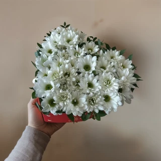 Великолепная композиция из белой ромашковой хризантемы в форме сердца – это истинное произведение искусства природы. Белоснежные цветы, словно звезды на небесах, излучают нежный свет и тепло, наполняя пространство вокруг чистотой и гармонией. Их лепестки, словно облака в ясном небе, легко и грациозно плывут по воздуху, создавая атмосферу легкости и изящества. Каждая ромашковая хризантема – это символ чистоты и невинности, который приносит в дом мир и умиротворение. Форма сердца коробки подчеркивает нежность и любовь, которые пронизывают эту композицию. Она словно говорит: "Я люблю тебя", не нуждаясь в словах.